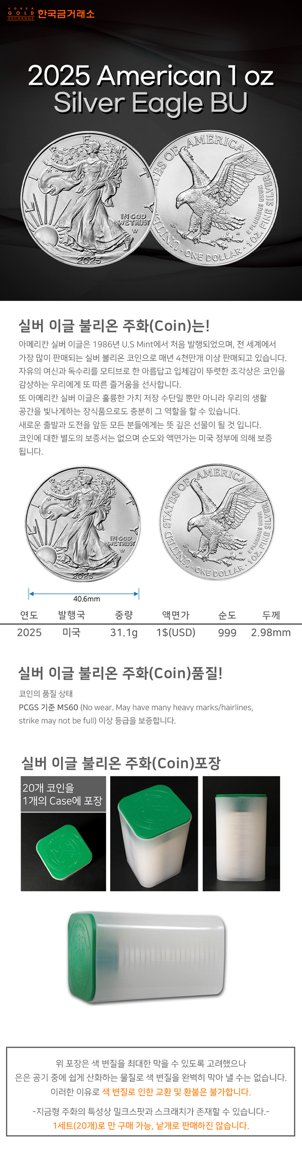 2025 1온스 실버 이글 불리온 주화(Coin) 1$(USD) 20ea